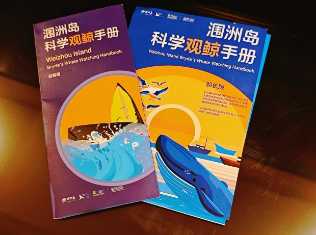 和钦州的观豚活动相似,观鲸旅游也已从初始探索走向成熟完善。广西壮族自治区同样针对观鲸活动制定印发了《北部湾涠洲岛观鲸护鲸指南》,用于科学引导公众对布氏鲸的观赏与保护行为。陈炳耀老师则向我们分享了南京师范大学与涠洲岛旅游区管理委员会等单位共同制作的涠洲岛科学观鲸手册。手册分为船长和游客版,详尽记录了布氏鲸的基本知识、行船原则和观鲸注意事项等,简单易懂。